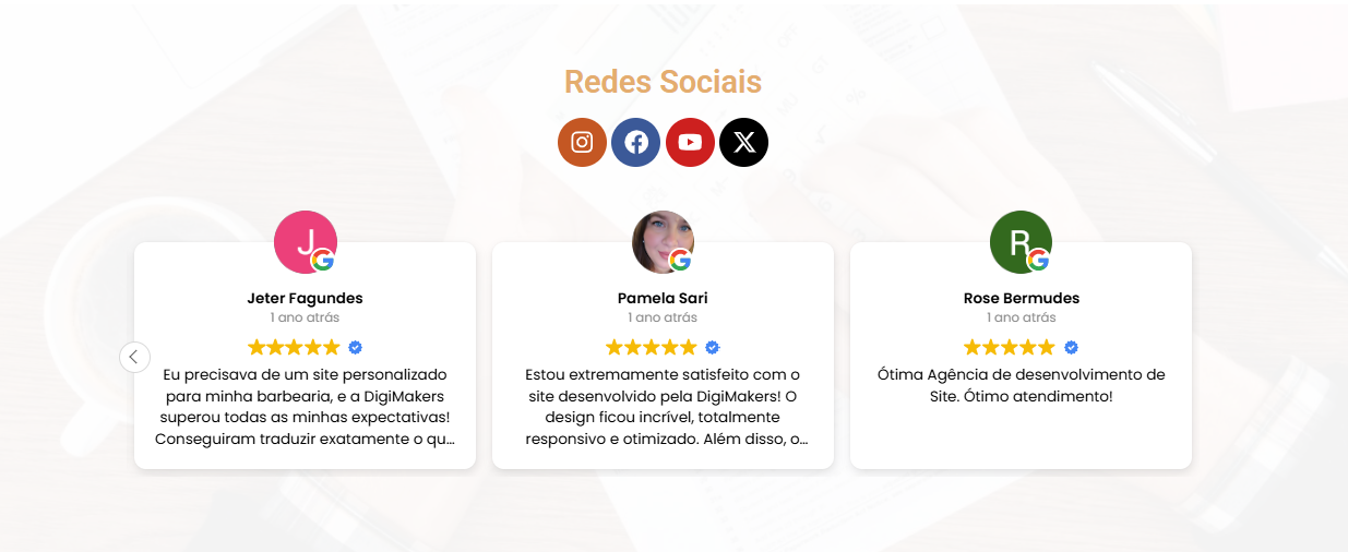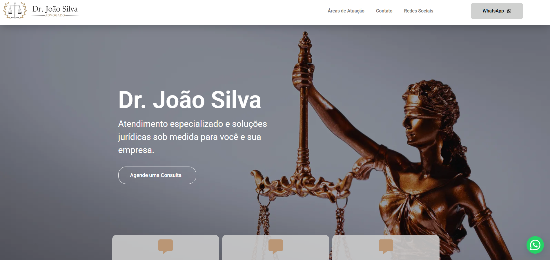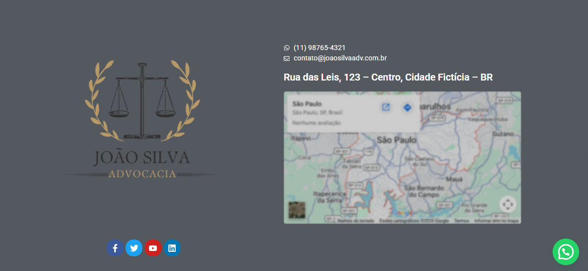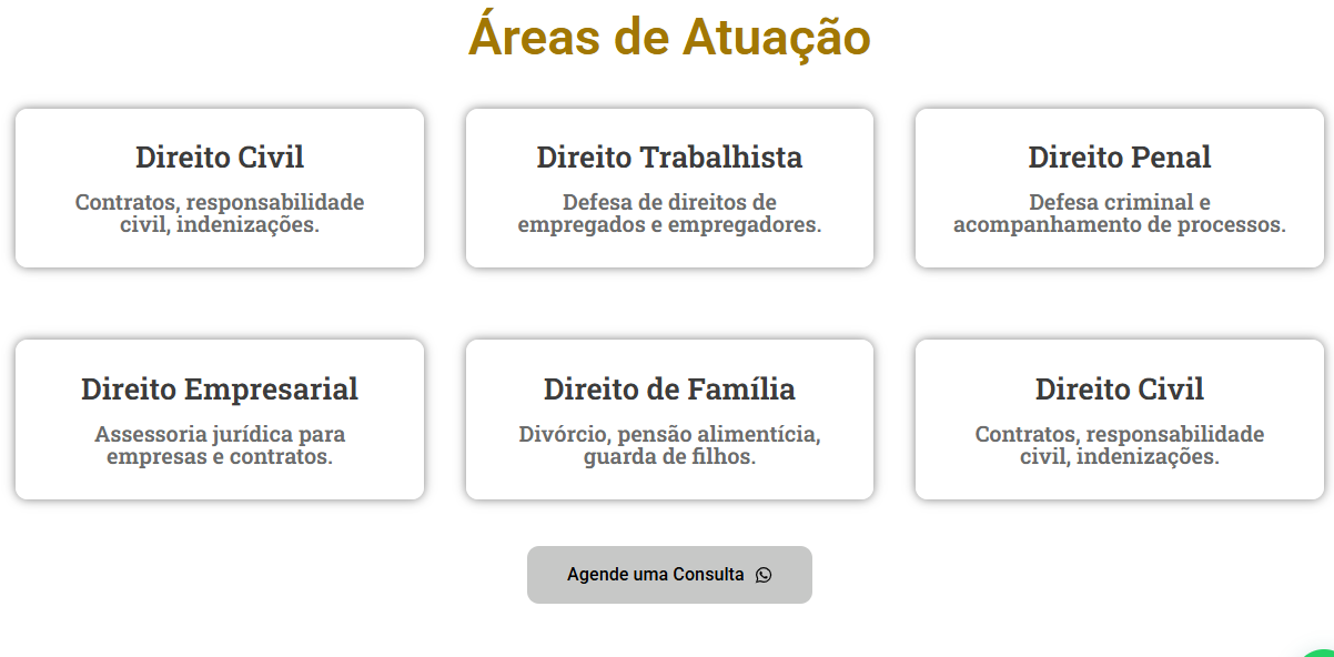 O site é responsivo, funcionando perfeitamente em celulares e computadores, e conta com integração com WhatsApp e redes sociais. A personalização é feita conforme a identidade visual do cliente, respeitando cores, tipografia e estilo do escritório. Também inserimos os textos e imagens enviados, adaptando todo o conteúdo ao modelo escolhido para manter um padrão profissional e focado em conversão.