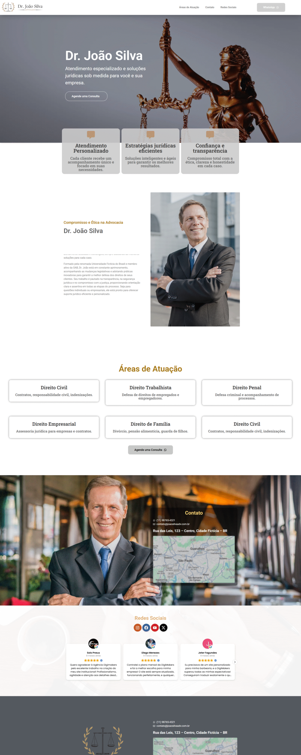 A estrutura valoriza a apresentação do escritório, áreas de atuação e informações essenciais, conduzindo o usuário de forma simples até o contato, seja por formulário ou WhatsApp, aumentando as chances de novos atendimentos.