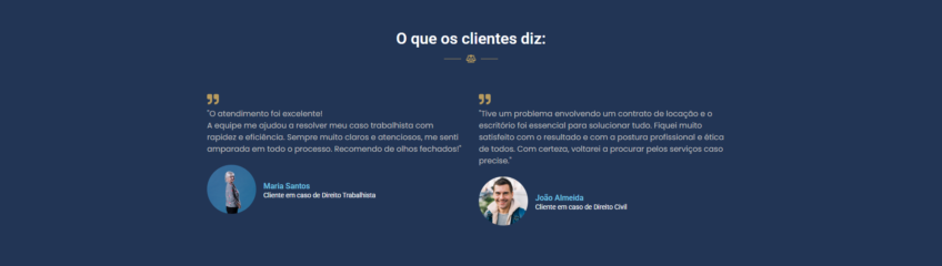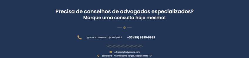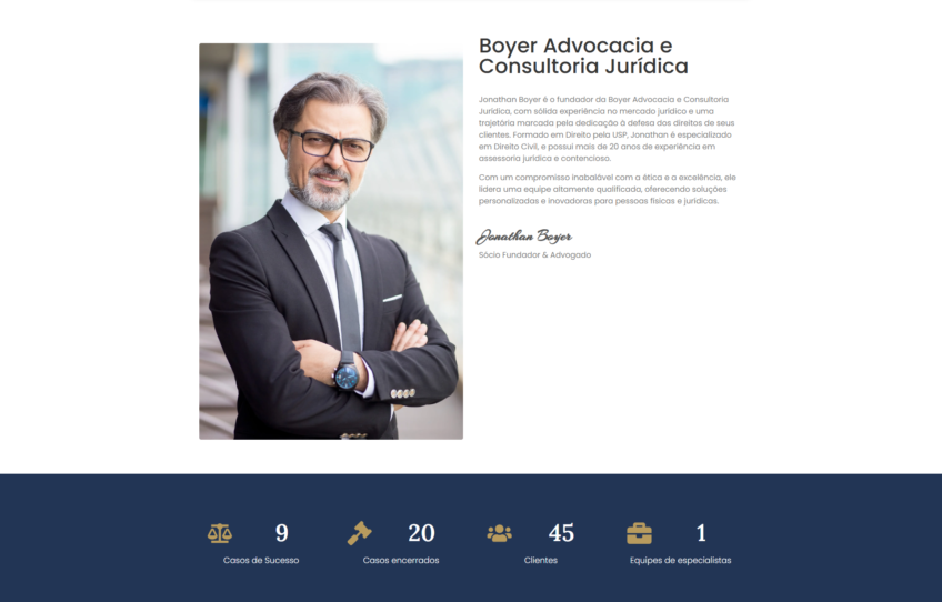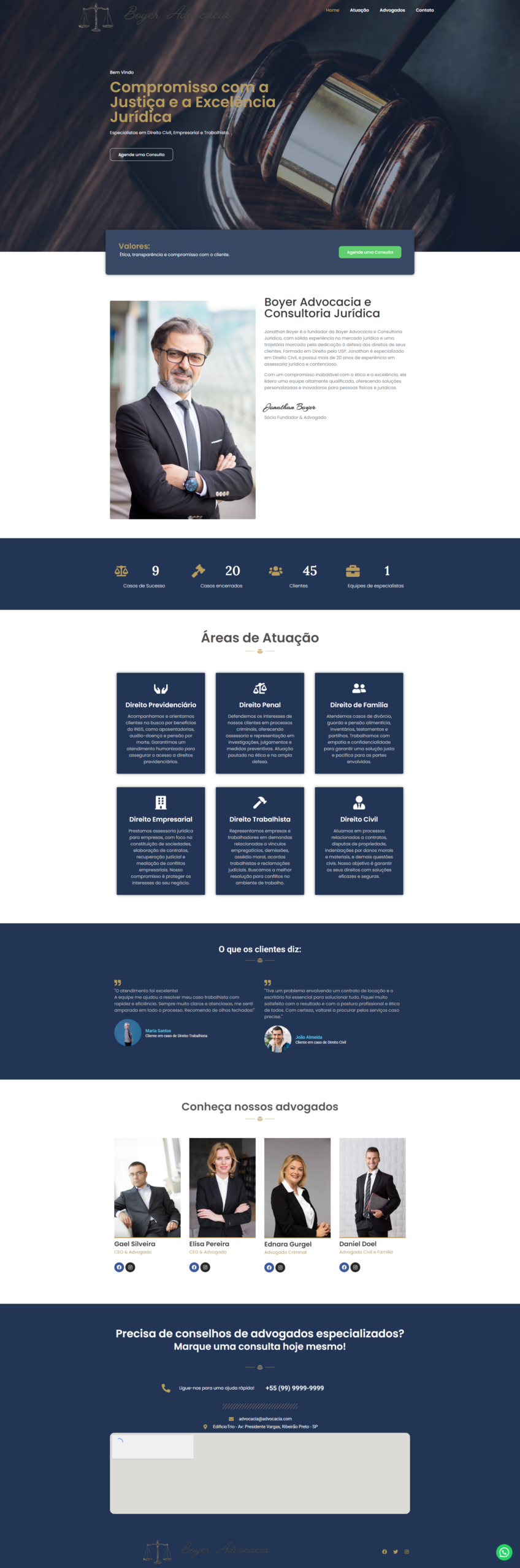 A estrutura valoriza a apresentação do escritório, áreas de atuação, equipe e diferenciais, além de incluir elementos estratégicos como prova social e chamadas para ação que facilitam o contato e a geração de novos clientes.