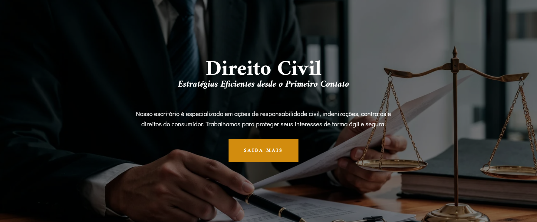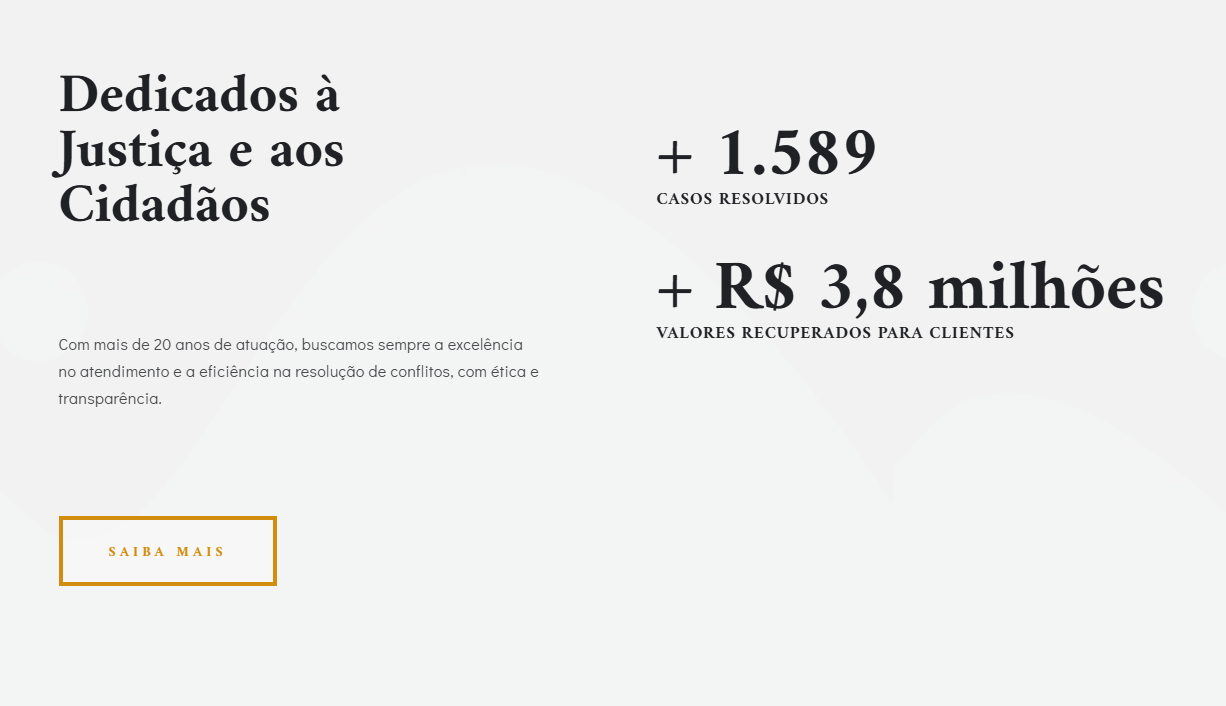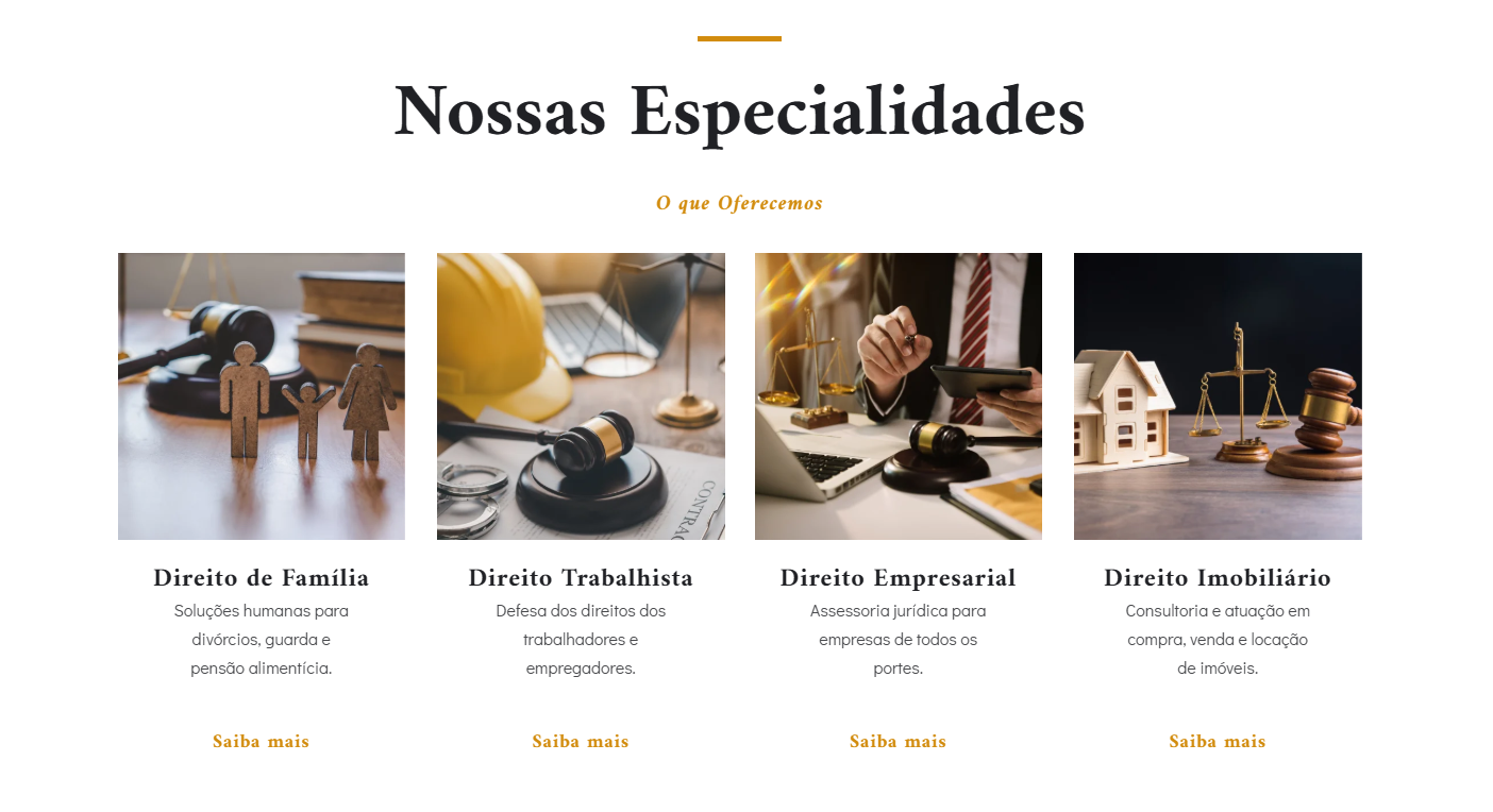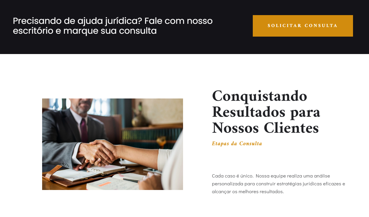 A estrutura destaca áreas de atuação, especialidades e diferenciais do escritório, além de utilizar chamadas estratégicas que incentivam o visitante a entrar em contato com facilidade, seja para solicitar uma consulta ou tirar dúvidas.