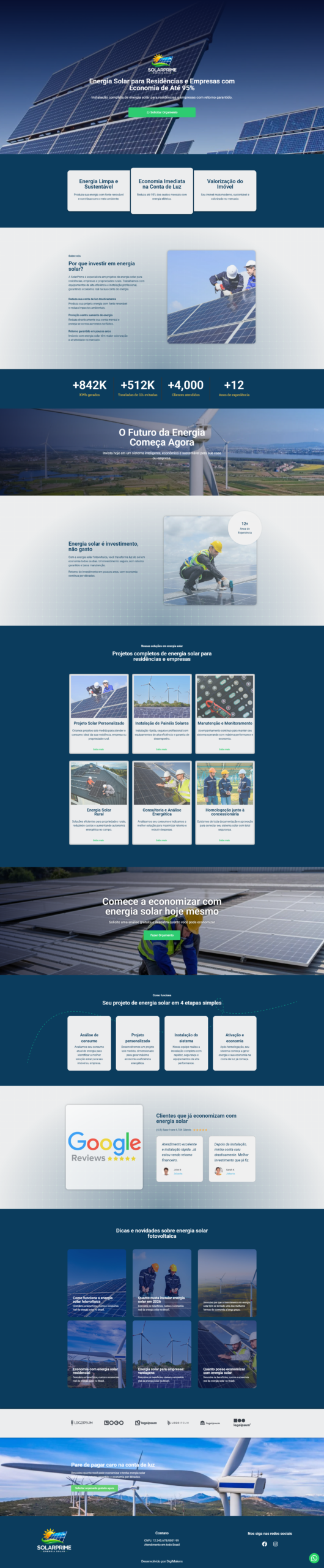 A página recebeu um visual moderno e profissional, com identidade visual alinhada ao segmento de energia solar fotovoltaica, utilizando elementos gráficos que transmitem inovação, tecnologia e confiança. O layout responsivo garante excelente navegação em celulares, tablets e desktops.