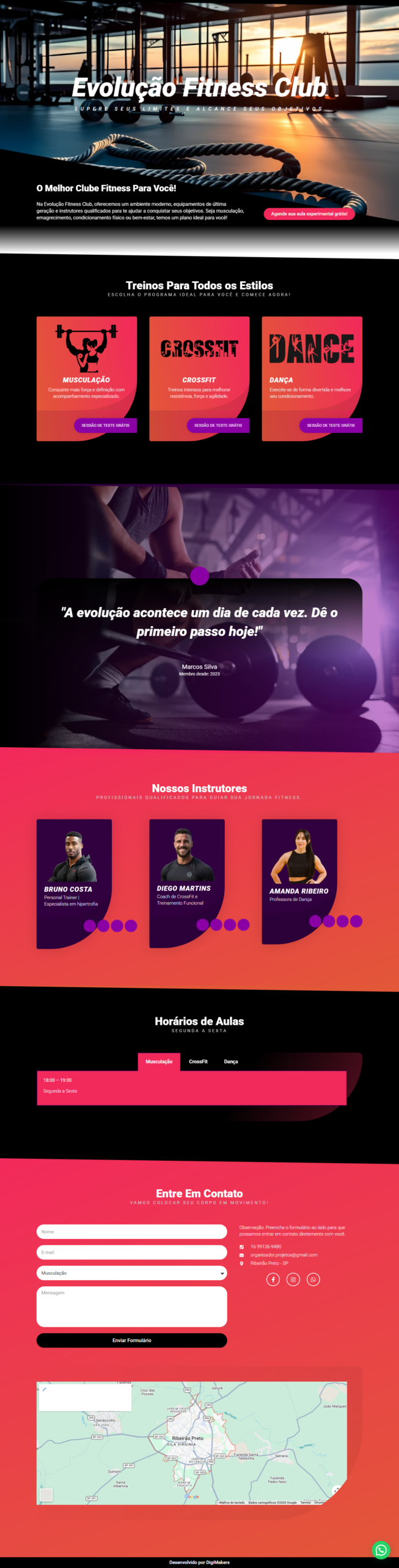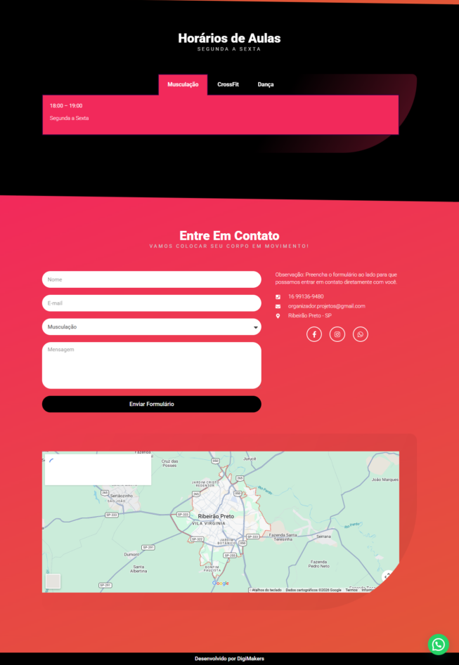 O site é responsivo, funcionando perfeitamente em celulares e computadores, e possui integração com WhatsApp, redes sociais e mapa de localização. A personalização é feita conforme a identidade visual do cliente, respeitando cores, tipografia e estilo da academia. Também inserimos os textos e imagens enviados, adaptando todo o conteúdo ao modelo escolhido para manter um padrão profissional e focado em conversão.